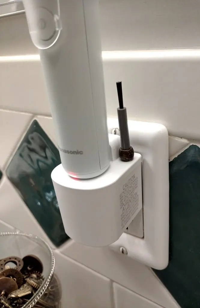 The only complaint I have about this razor is that I wish the charger had a spot to attach the cleaning brush that comes with it. I use the cleaning brush a lot more often than I use the travel pouch or owners manual, so I want to keep it handy. However, I have a glue gun and an imagination, so I just added my own! That’s a large-hole bead that I glued onto the top of the charger, and the brush fits inside.
